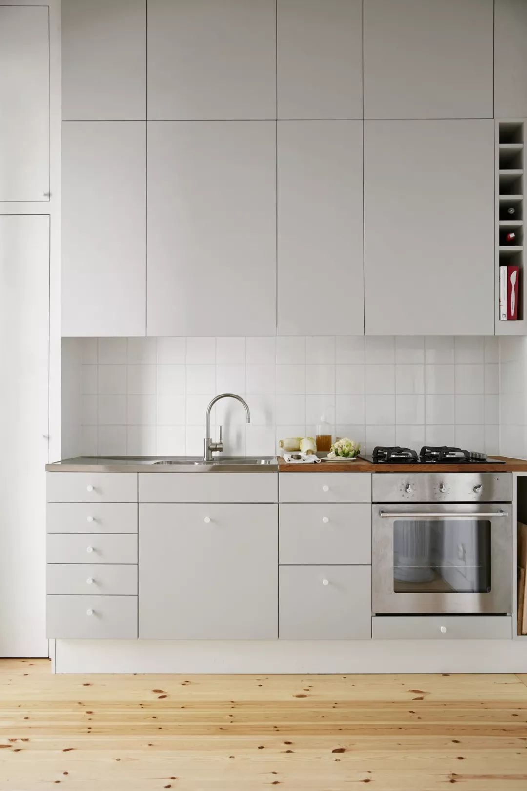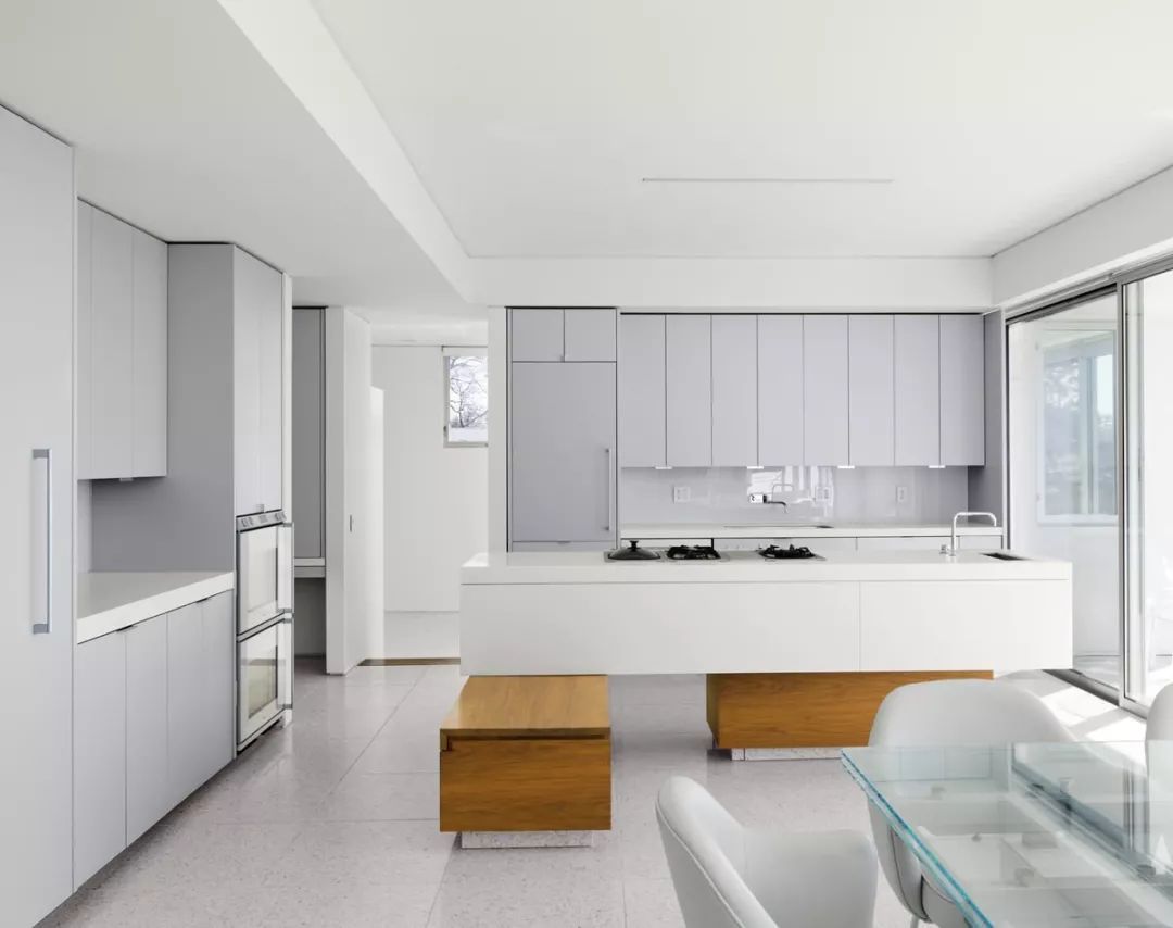 ◆色彩偏冷。冷淡的色系更显空间干净整洁,白色、原木色和灰色是简约主义厨房的主打色系。冷色系能够展现材料本身的自然特性,突出家具设计的美感。